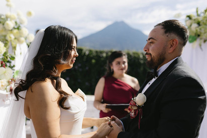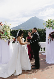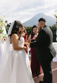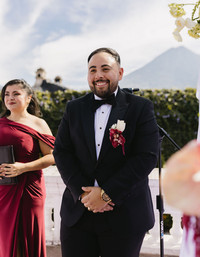 The ceremony was on the Hotel Pensativo terrace. The volcano behind them, Antigua's sky holding the scene. And best of all: Yanet, Leslie's cousin, officiated.